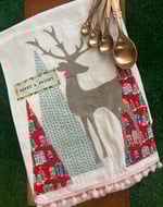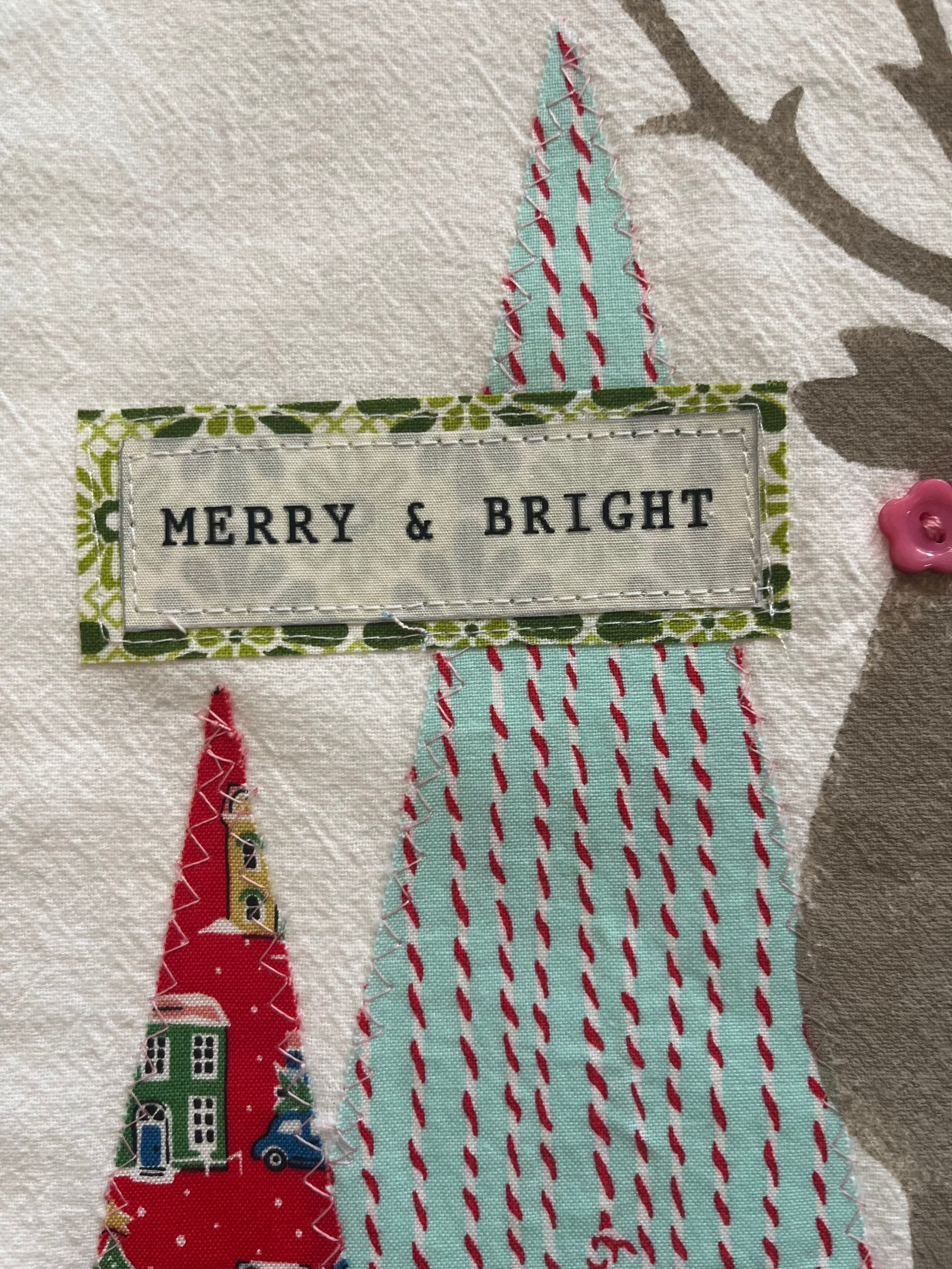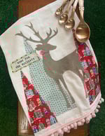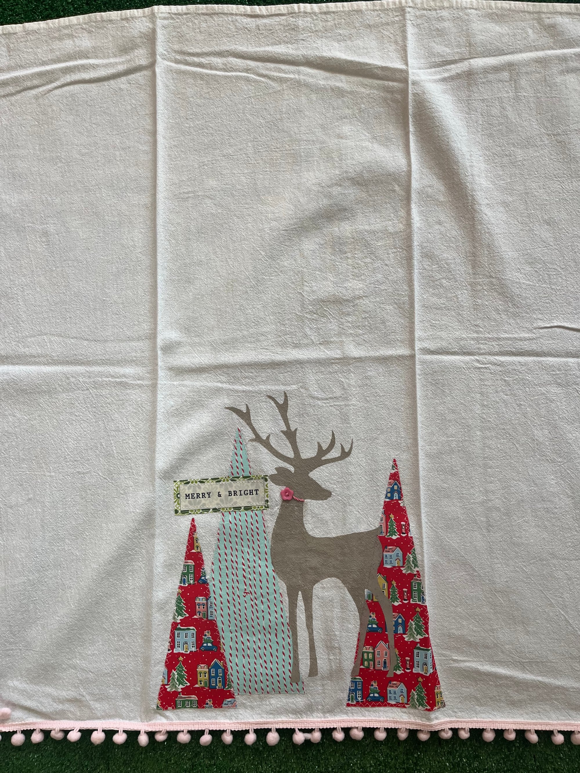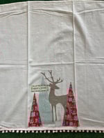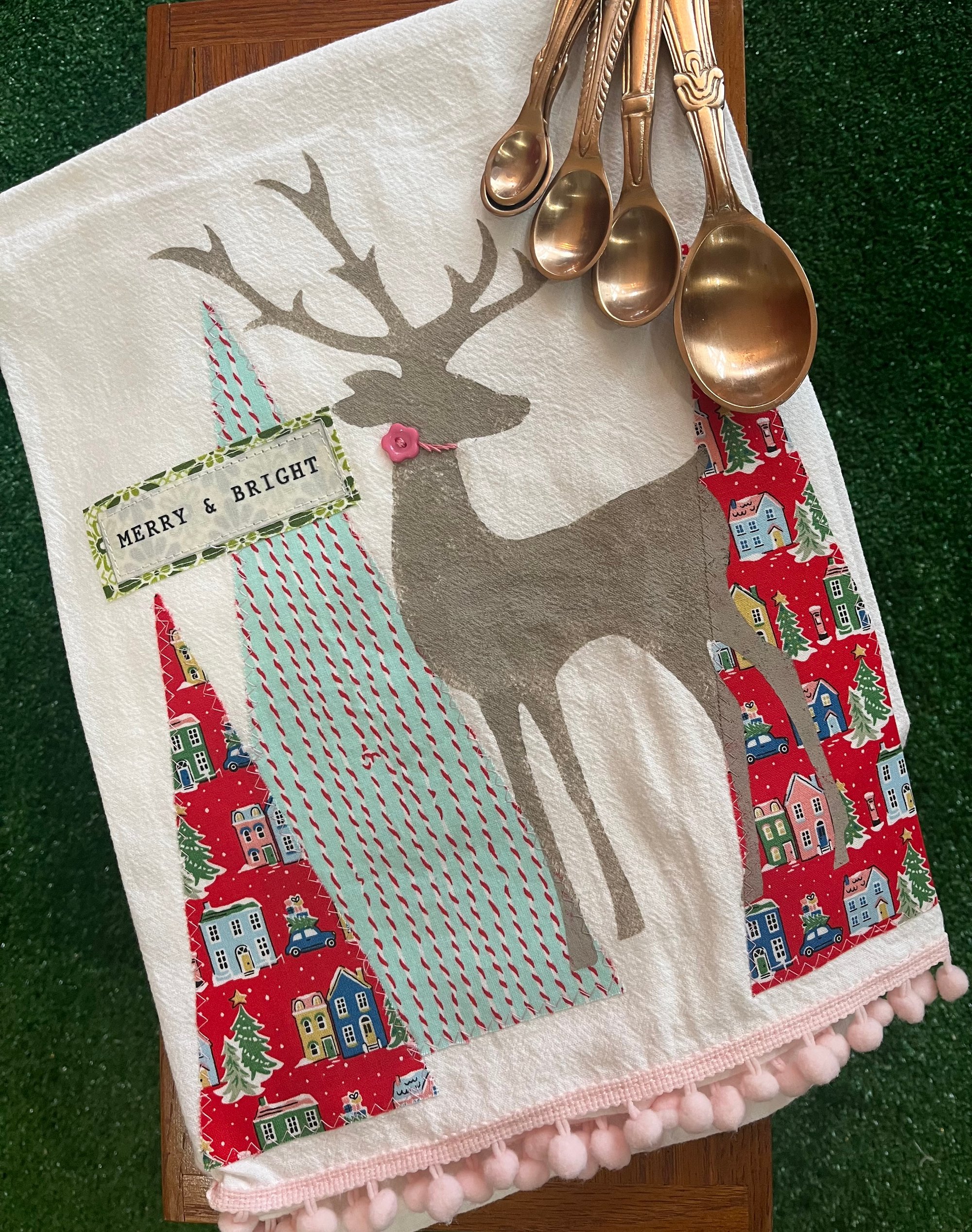 Flour sack towel with a gray deer stencil. Tree appliques are Liberty of London red winter houses and a light aqua candy cane striped fabric.