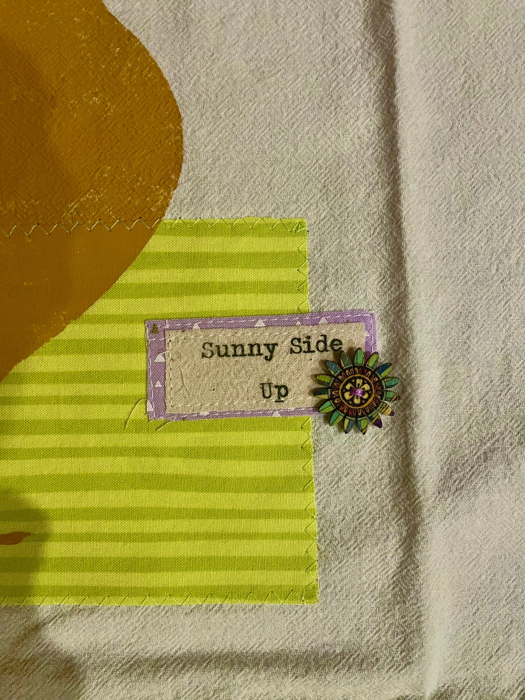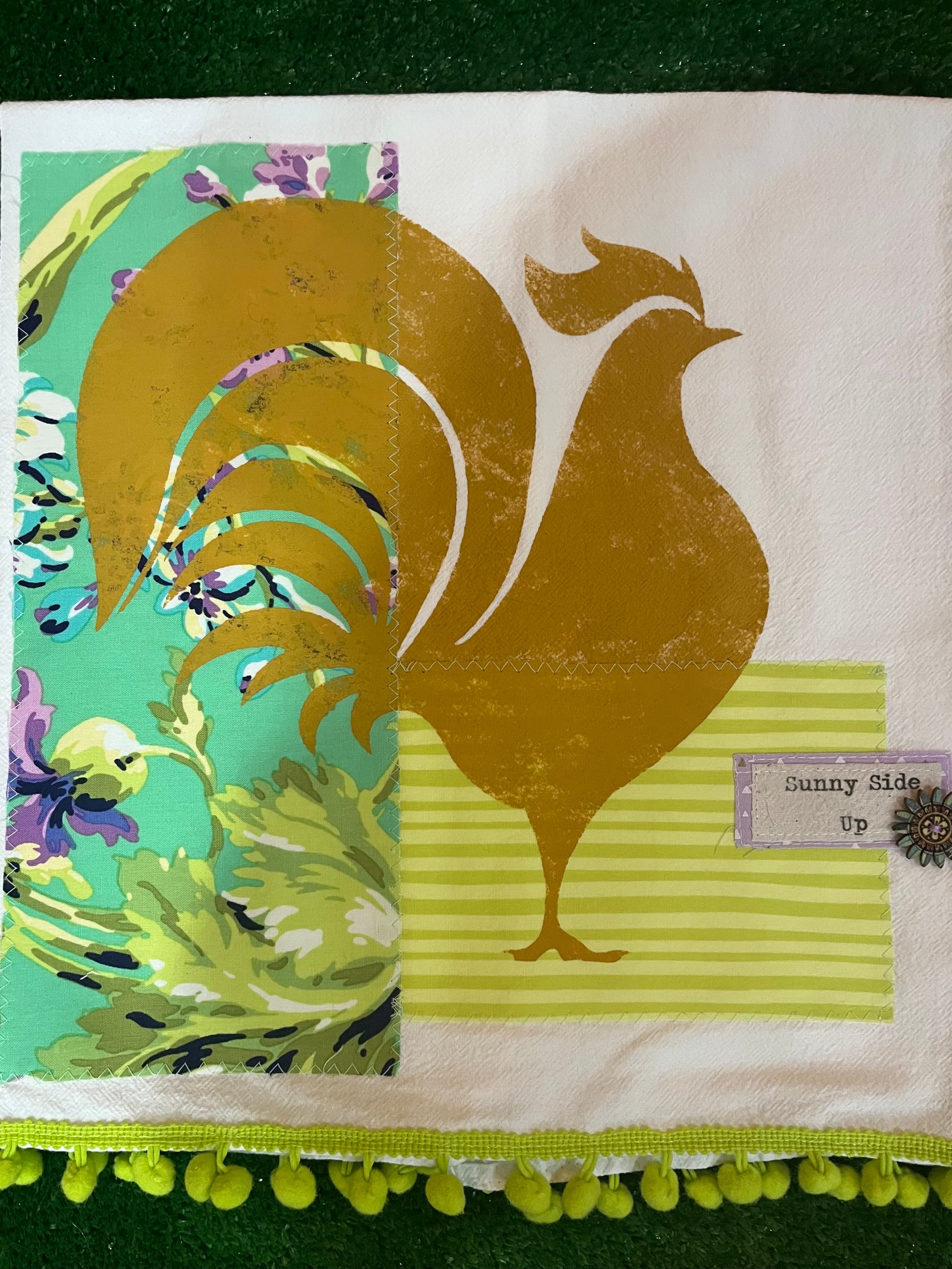 Flour sack towel with maize stenciled rooster, accent fabric is a stunning large lilac colored fabric with shades of navy on a mint background. . Complementing fabric is a bright green stripe. Towel is finished with a green pom pom trim and a wood button.
