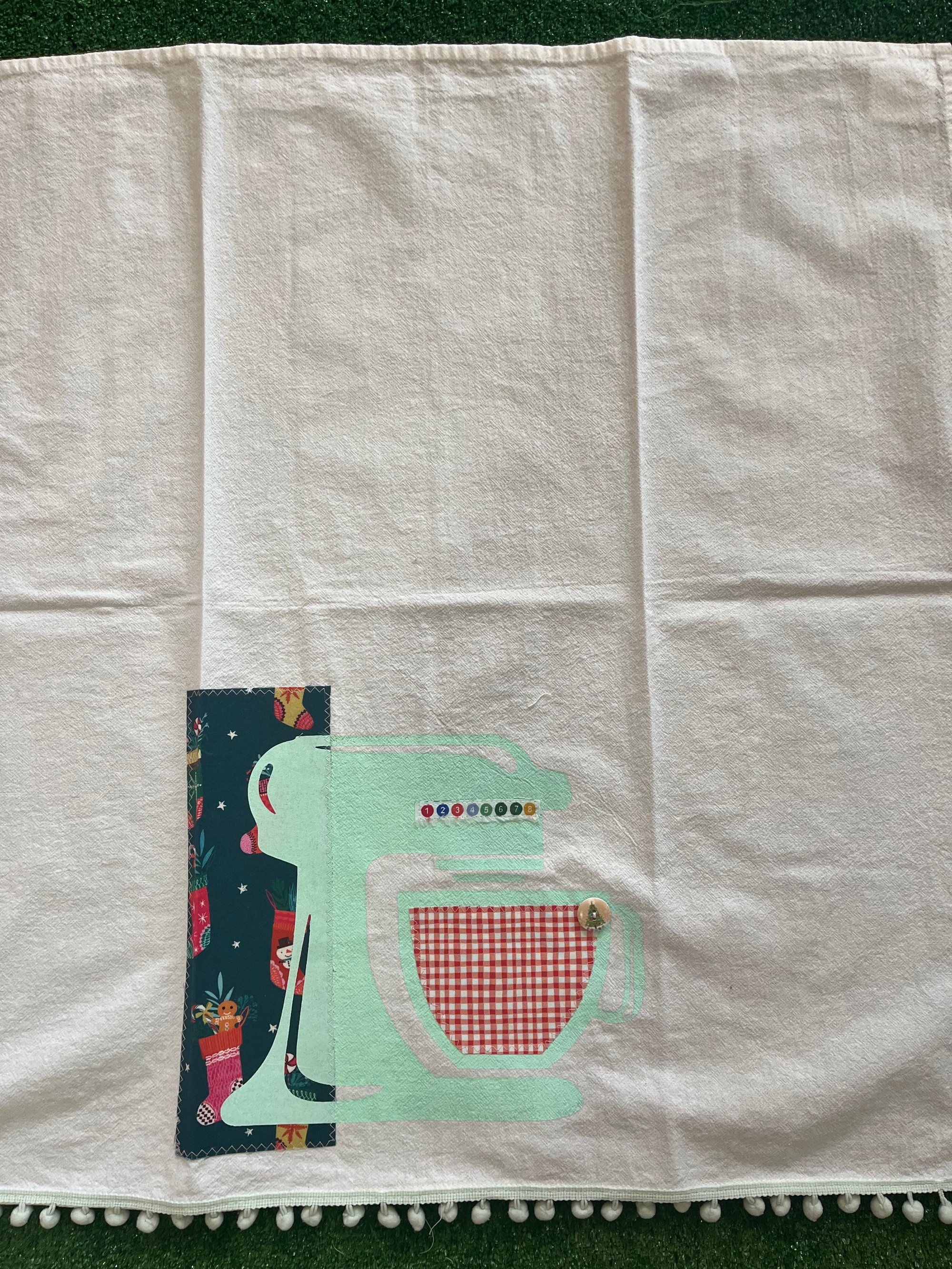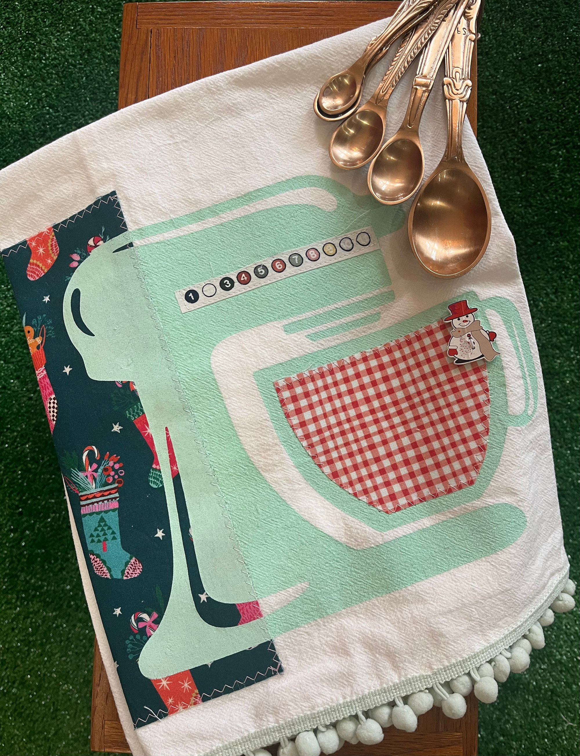 Flour Sack Towel, Mint Green Stenciled Mixer on Dark Green Christmas Fabric