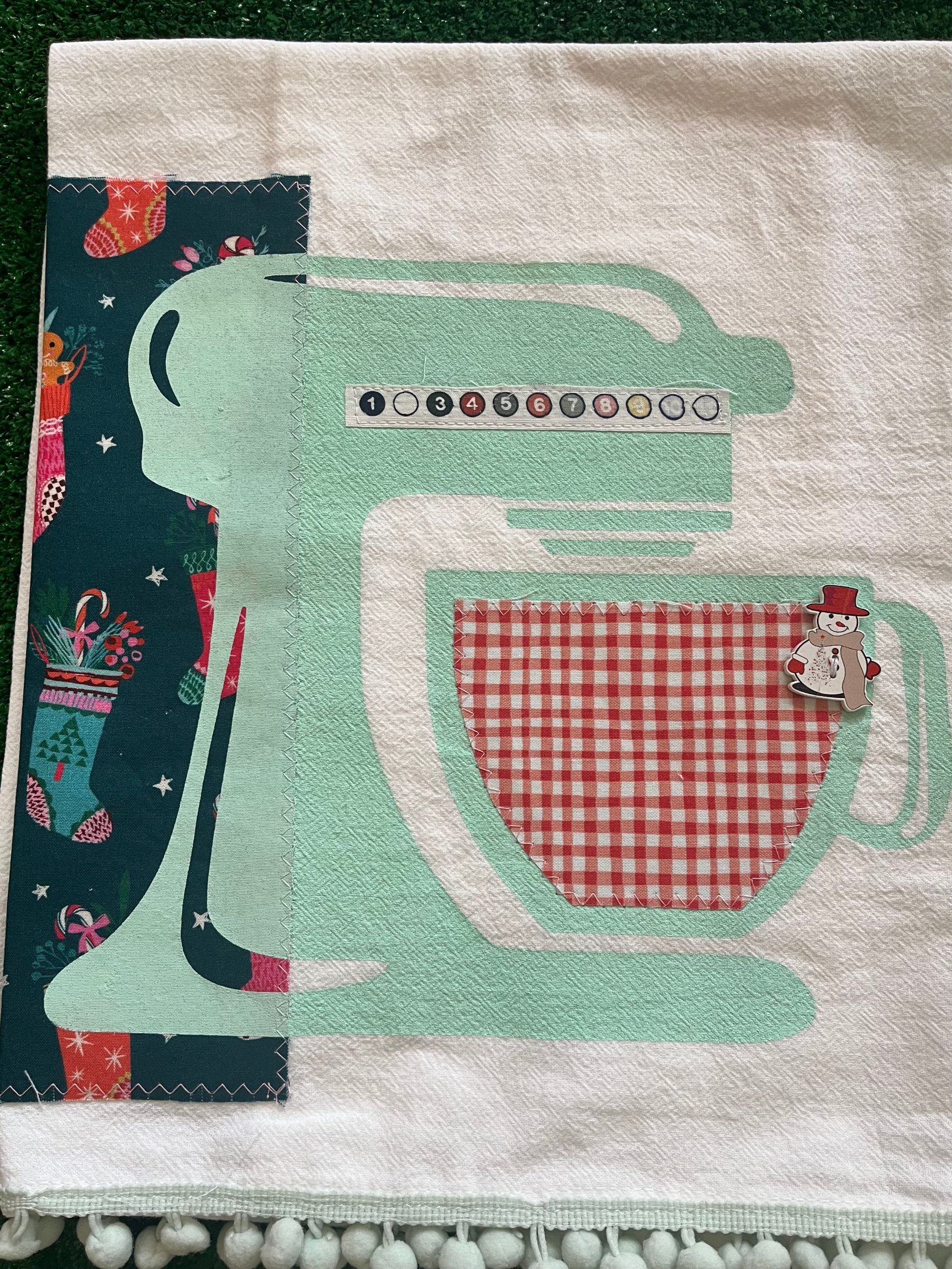 Mint Stenciled Mixer on a sweet dark green stocking print fabric. colors are pink, red, teal and orange. Accent fabric is a tomato red small checked fabric. Finished with a mint green pom pom trim.
