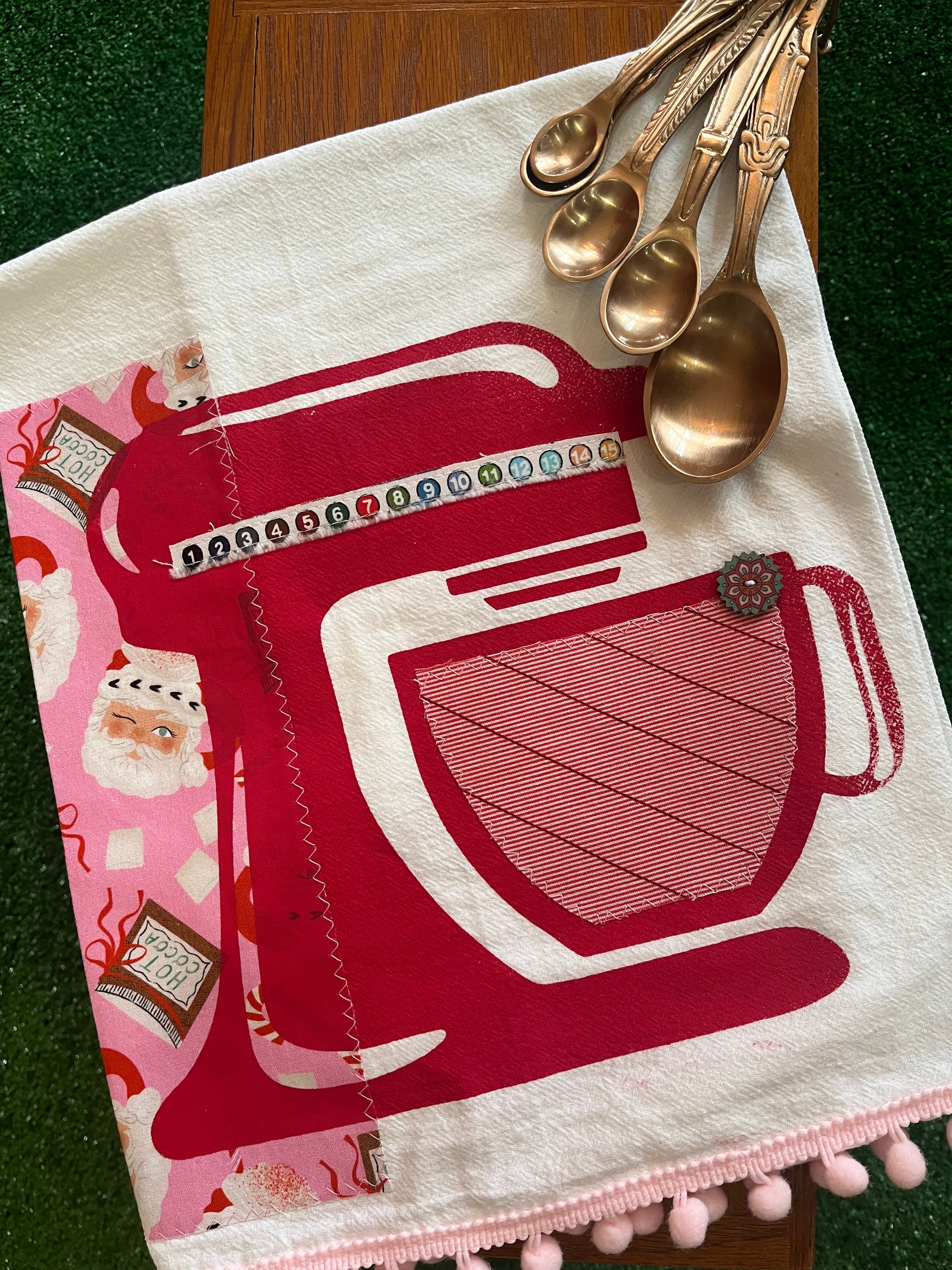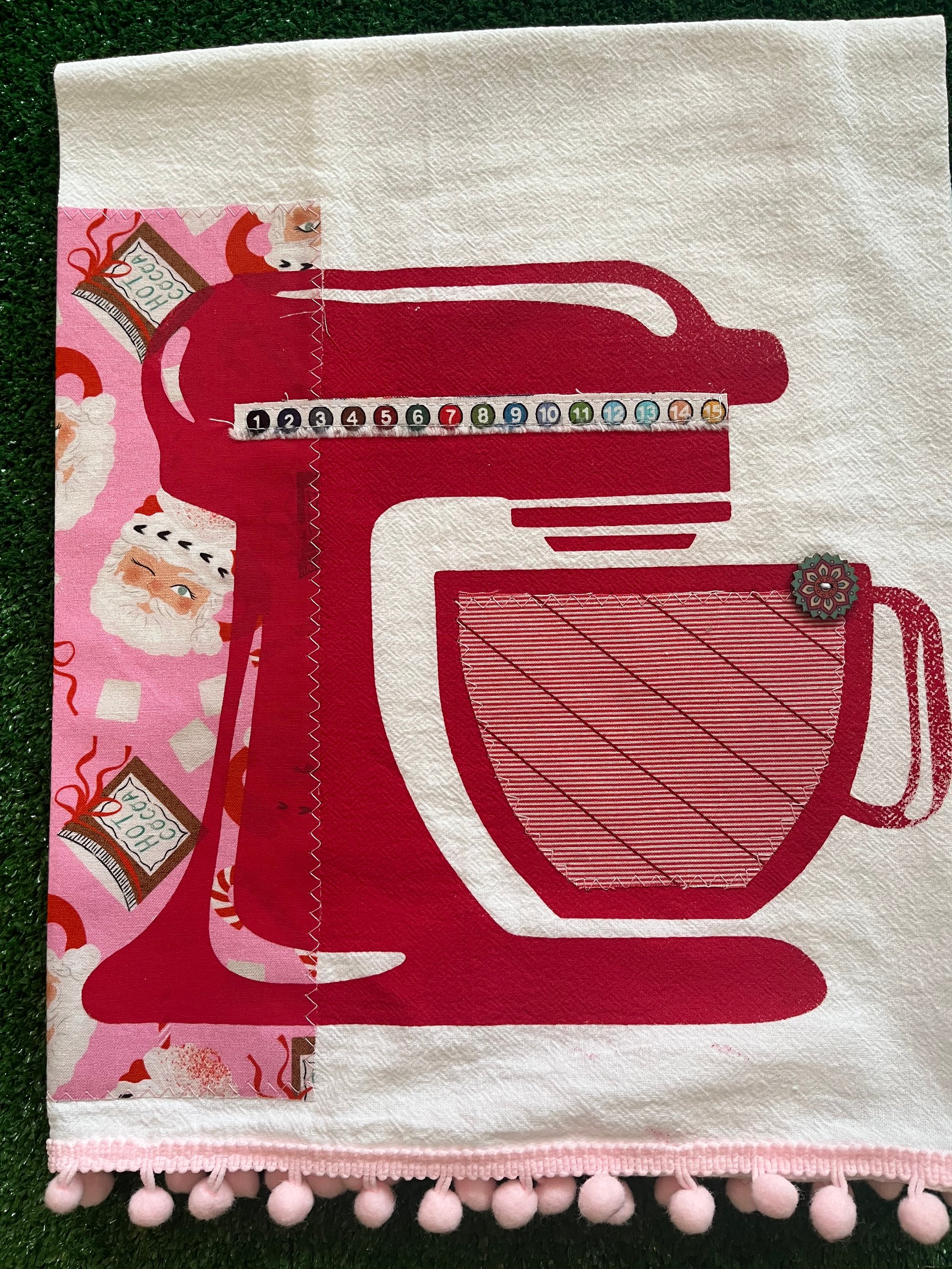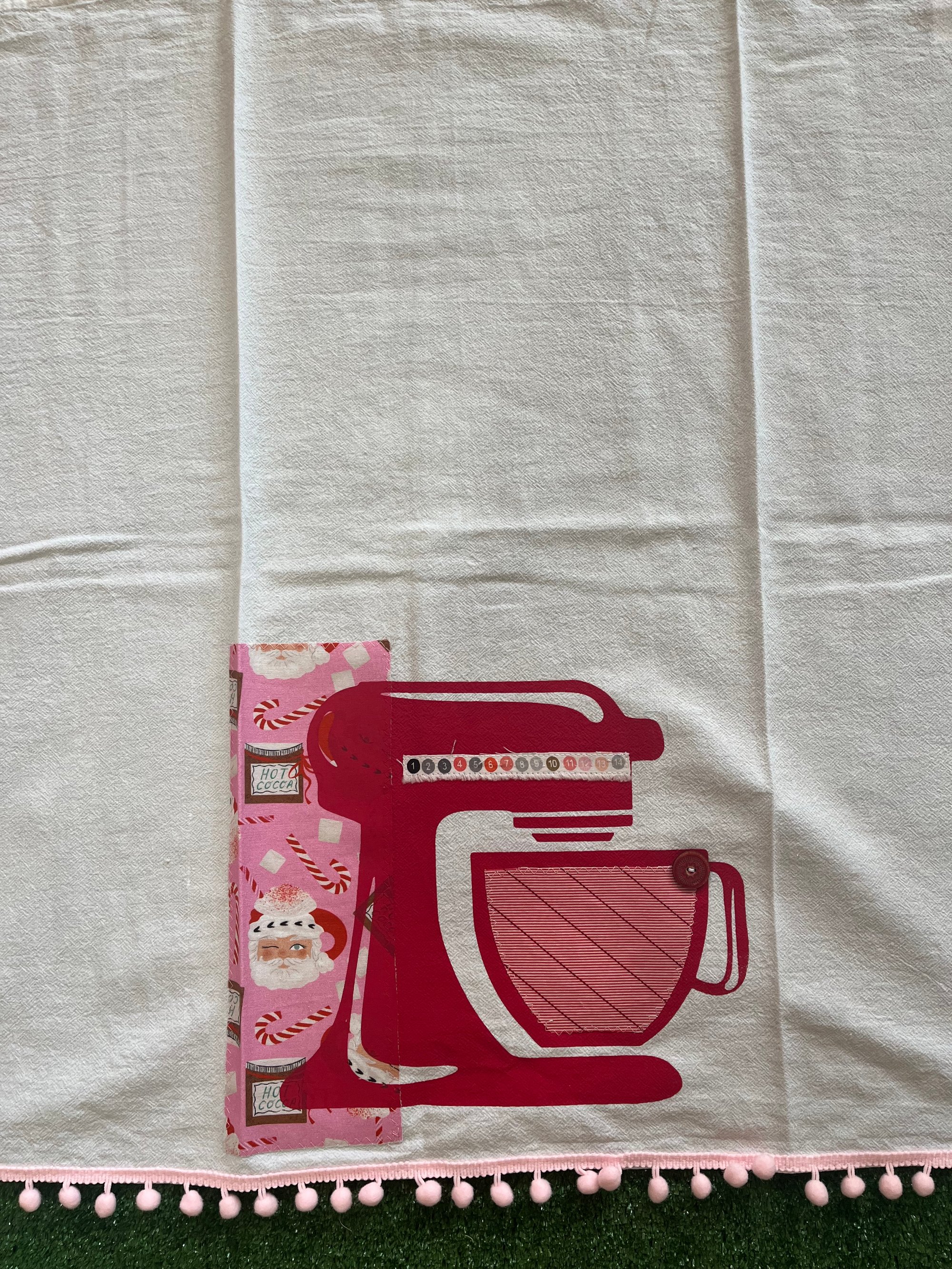 Flour sack towel with red stencil mixer. Accent fabric is pink with Santa and hot chocolate mugs. Towel is finished with a round button and light pink pom pom trim