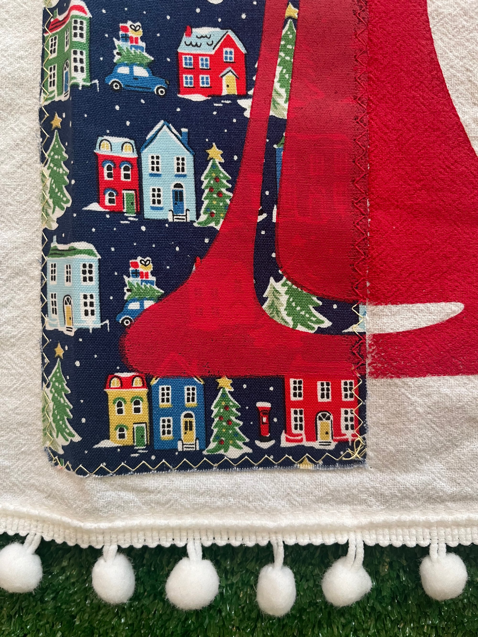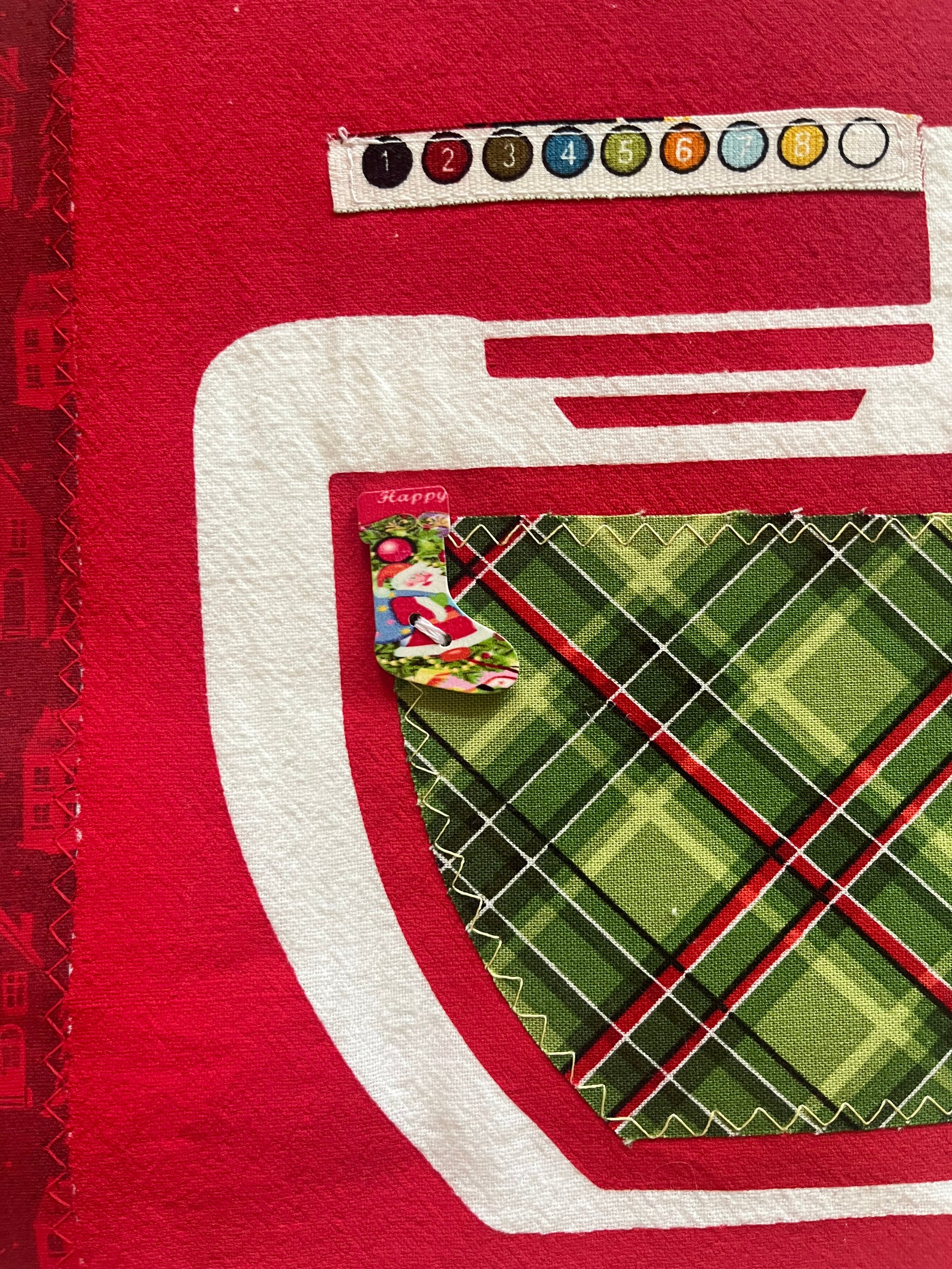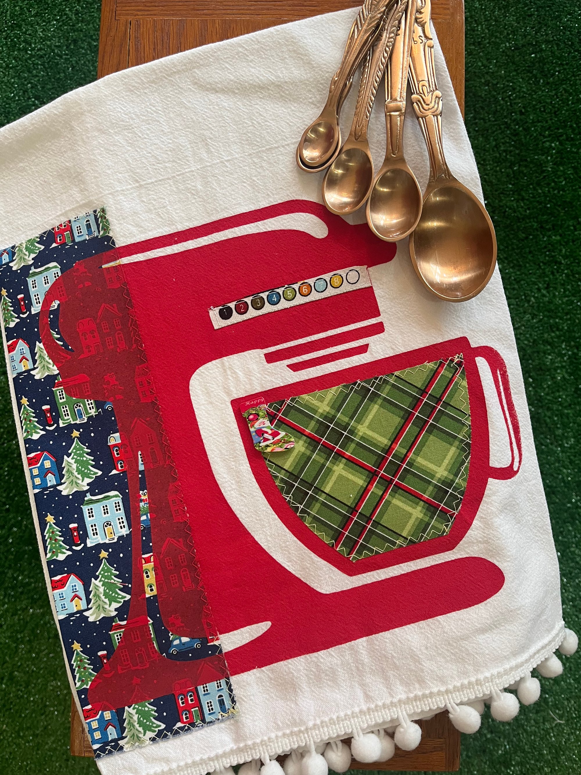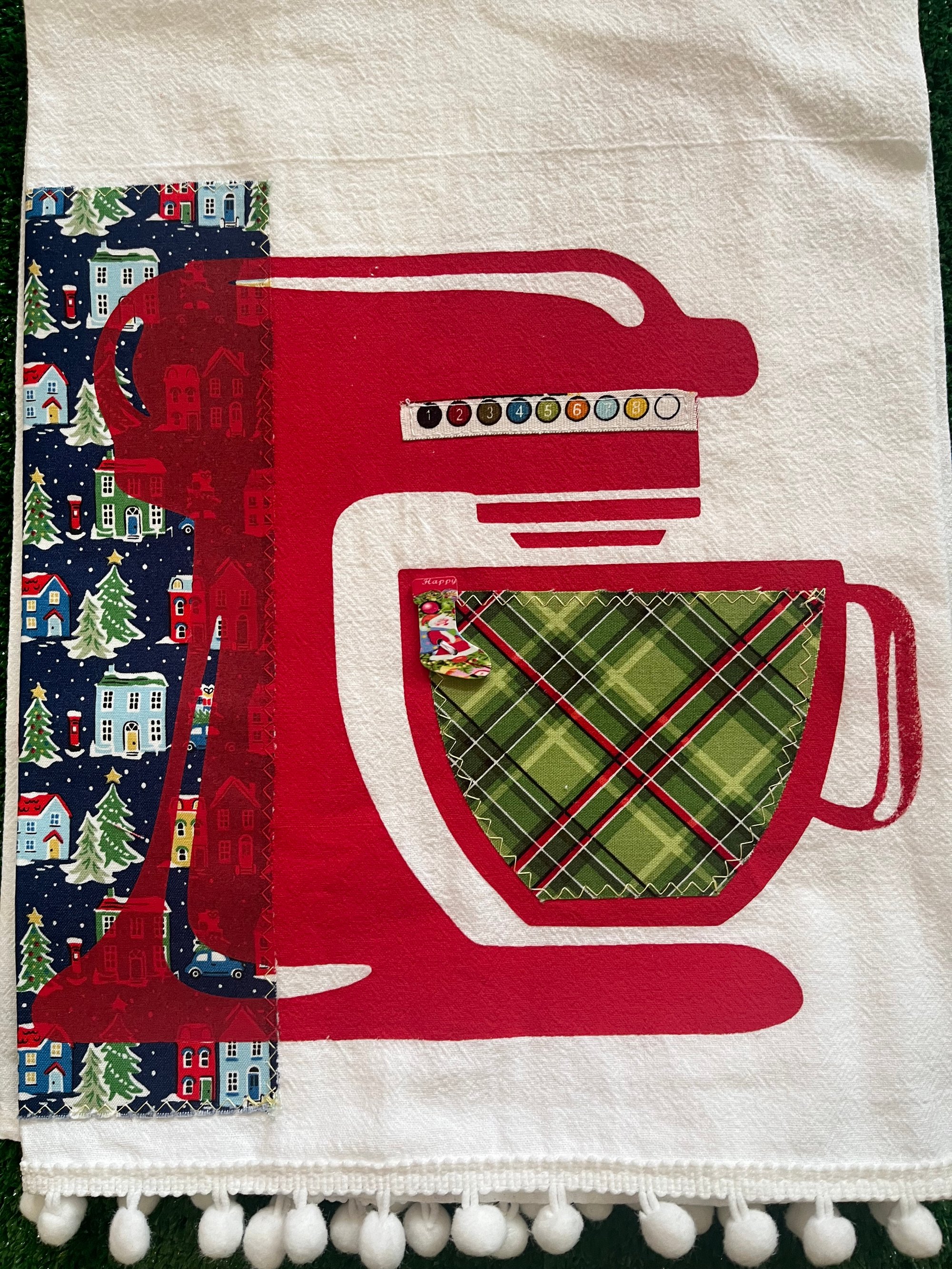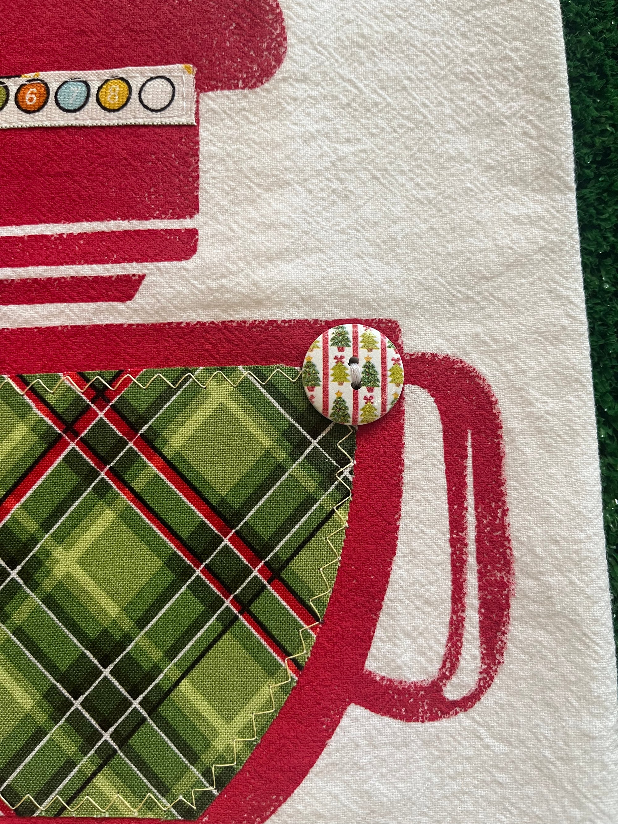 Flour sack towel with red stenciled mixer, focal fabric is Liberty of London navy blue winter houses. Houses are red, blue and gold. Accent fabric is green and red plaid. Complementing fabric is a bright green plaid. Finished with a white pom pom trim.