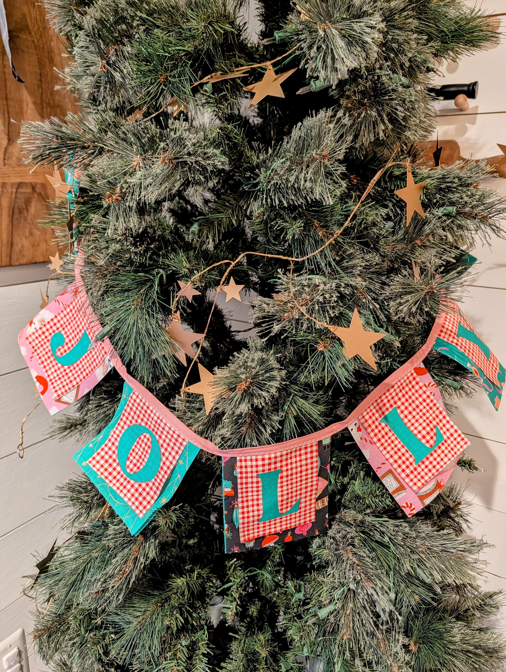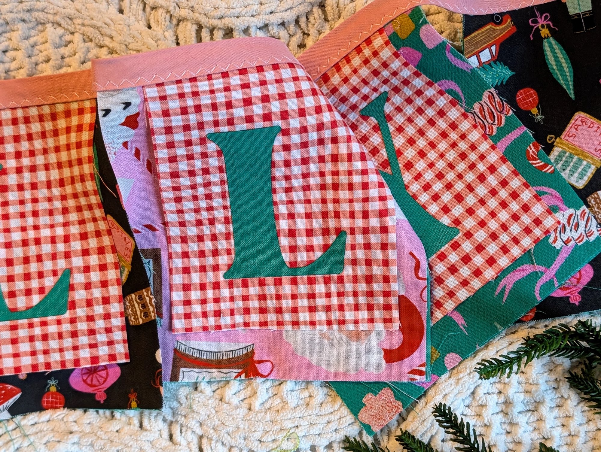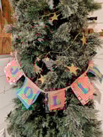 This 48-inch garland features seven festive 5" x 5" fabric squares—each made from designer cotton, including the ever-lovely Liberty of Dear Stella Holly Jolly prints. Each square is layered with three coordinating fabrics and finished with carefully crafted laser-cut letters.