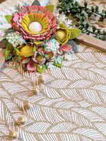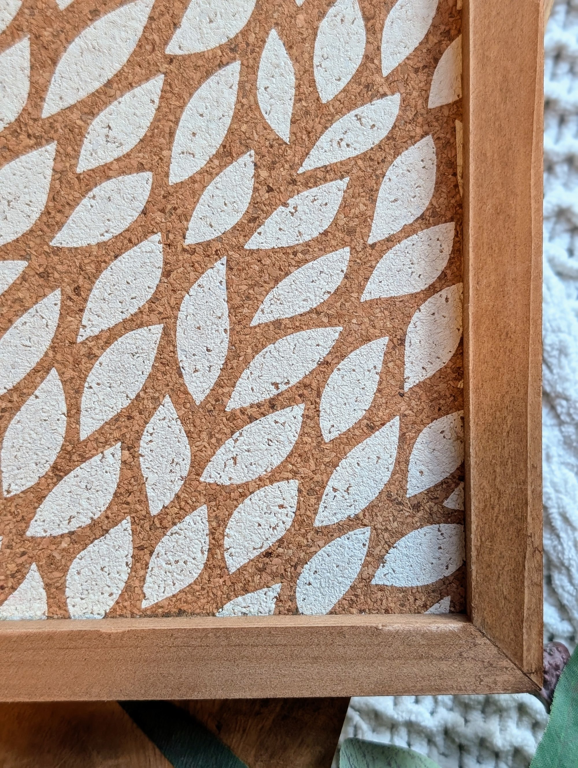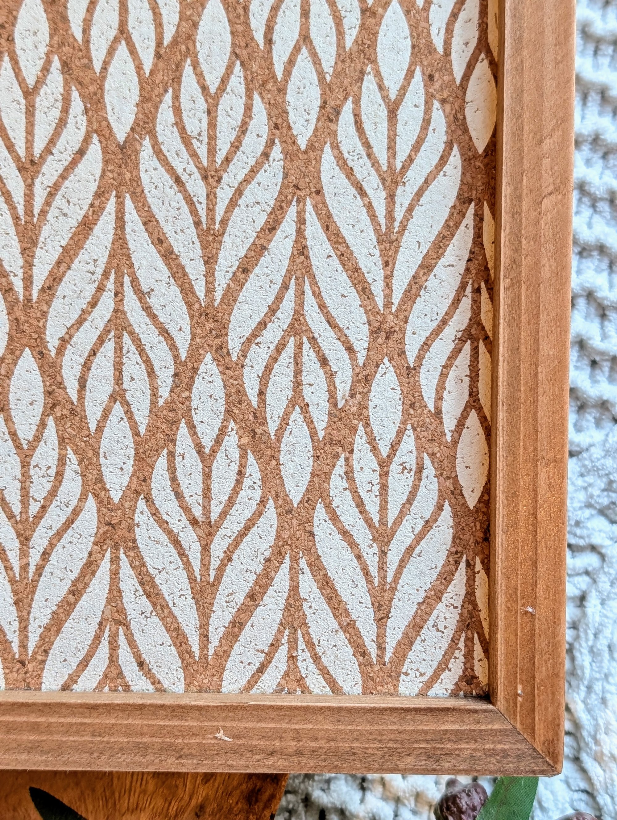 --Coral Charm – Warm coral florals with mustard tones and light green atop a playful wave patterned cork design, ideal for adding cheerful personality to your workspace or gallery wall.