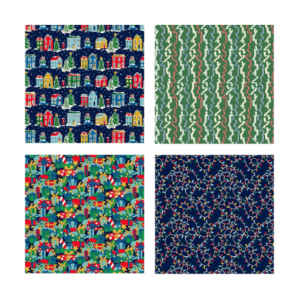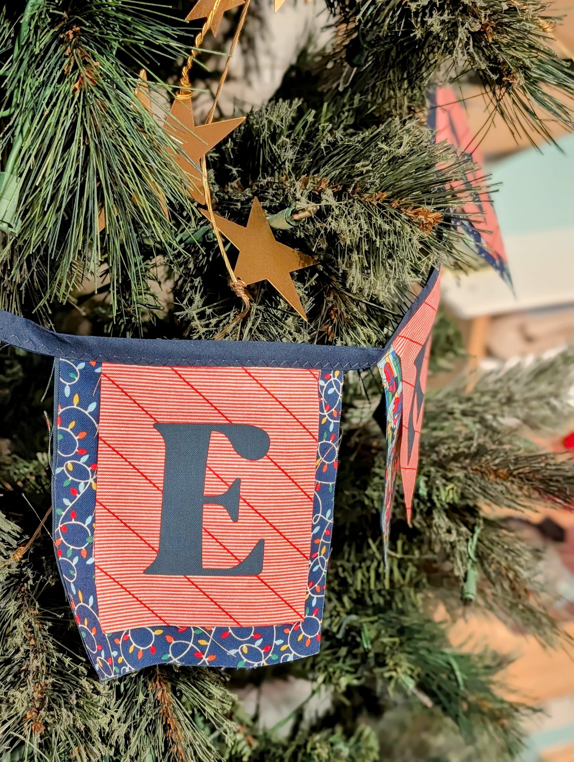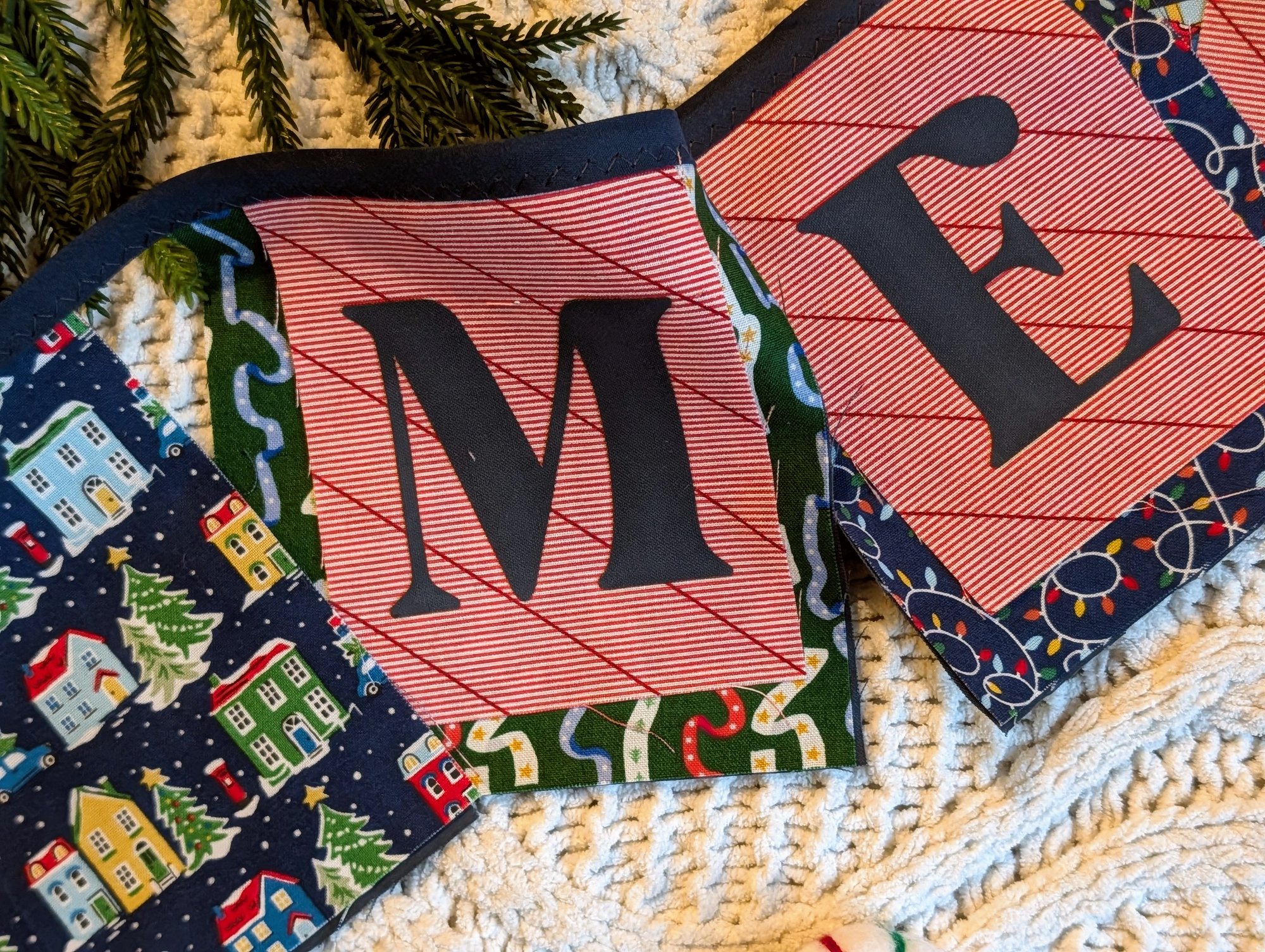 This 48-inch garland features seven festive 5" x 5" fabric squares—each made from designer cotton, including the ever-lovely Liberty of London Deck the Halls prints. Each square is layered with three coordinating fabrics and finished with carefully crafted laser-cut letters.