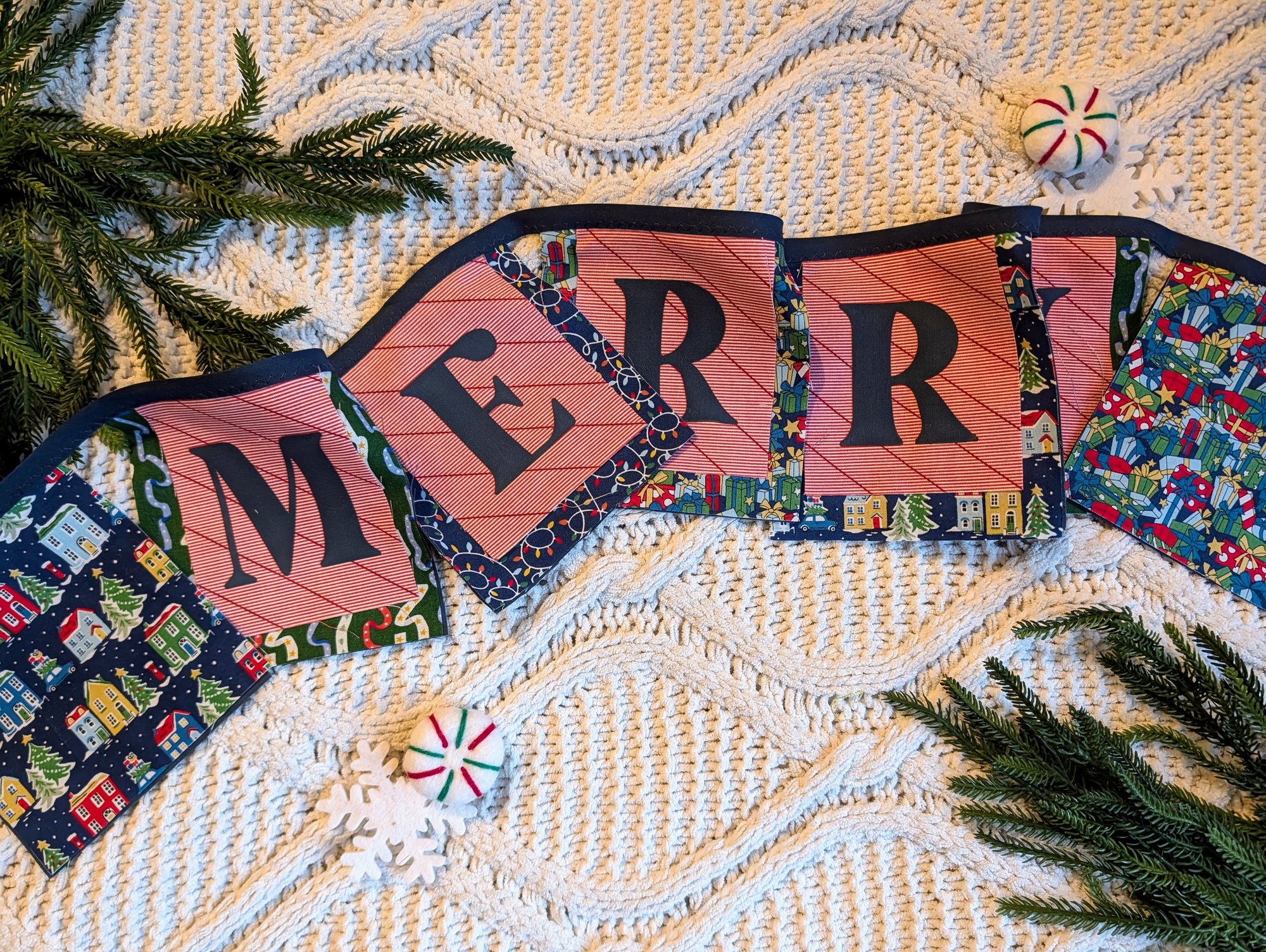 "Merry" Fabric Bunting in Navy, Red and Green