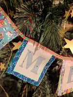This 48-inch garland features seven festive 5" x 5" fabric squares—each made from designer cotton, including the ever-lovely Liberty of London Deck the Halls prints. Each square is layered with three coordinating fabrics and finished with carefully crafted laser-cut letters.