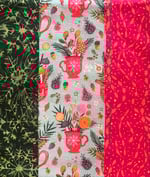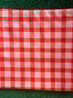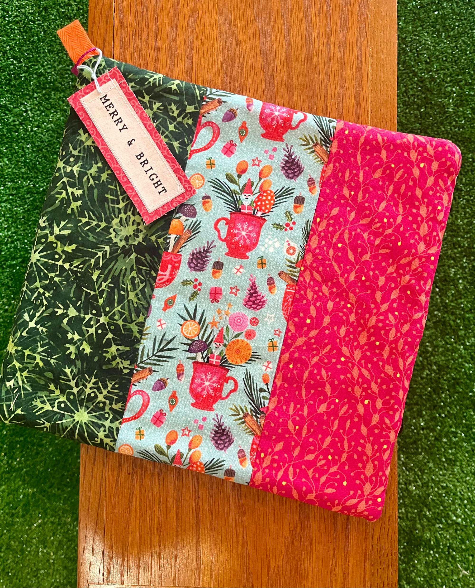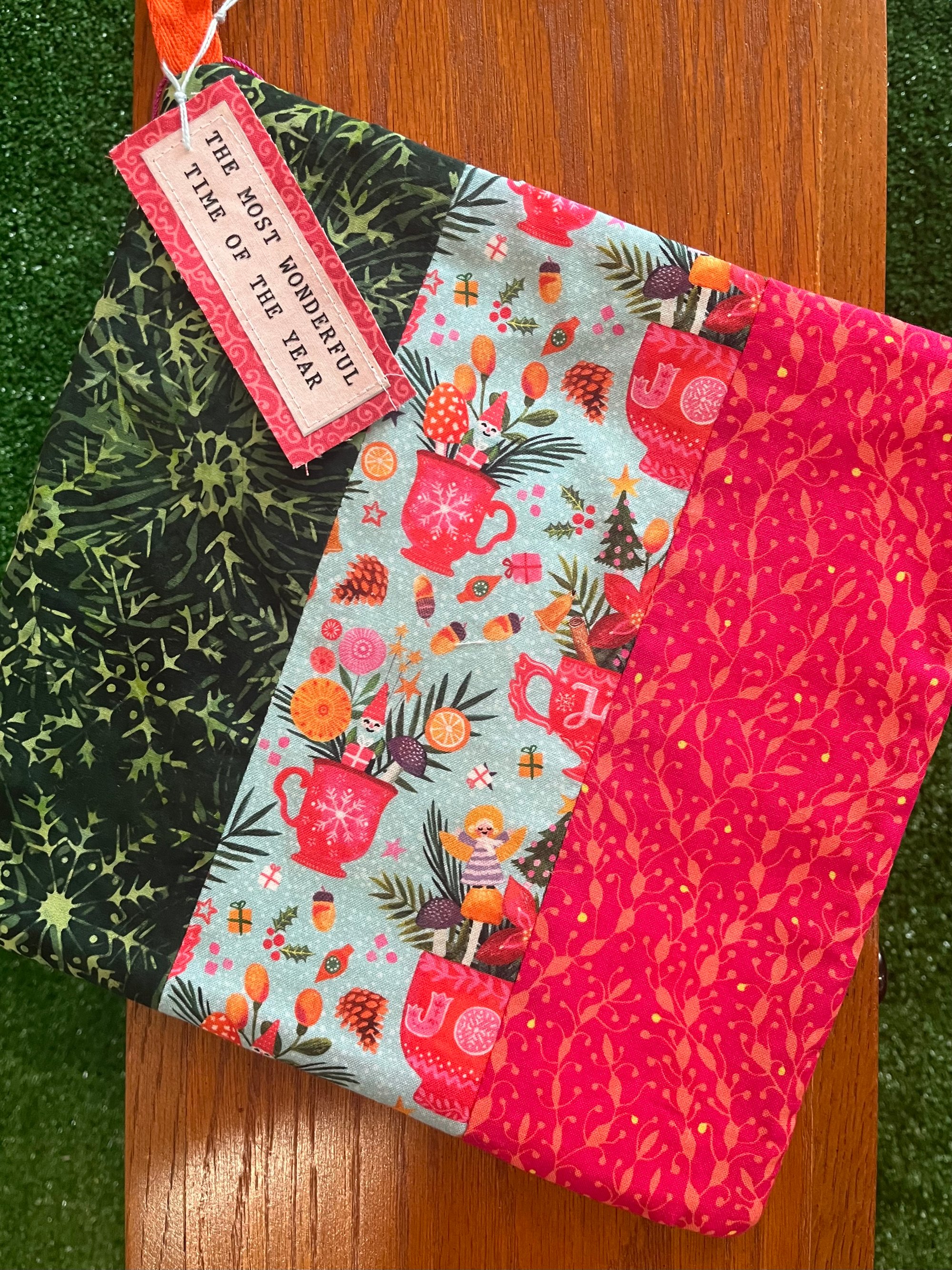 Pieced potholder with two layers of thick batting. Bright print of gnomes, angels and assorted items in a cup. Colors are blue, pink dark green and orange Accent fabrics are a batik dark green with snowflakes and vibrant pink. The back of the potholder is a red/orange plaid. Potholder measures 9X9 inches.